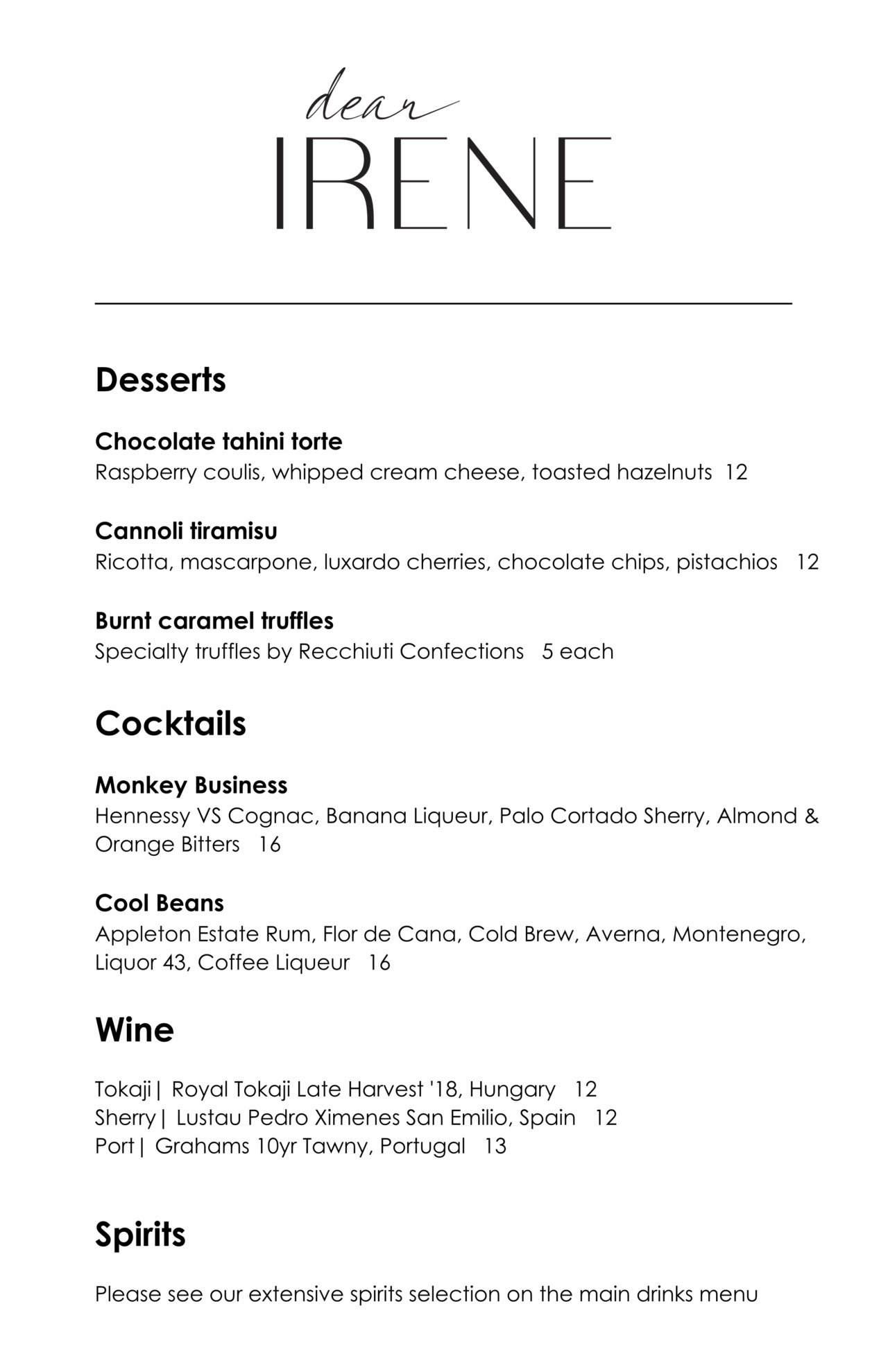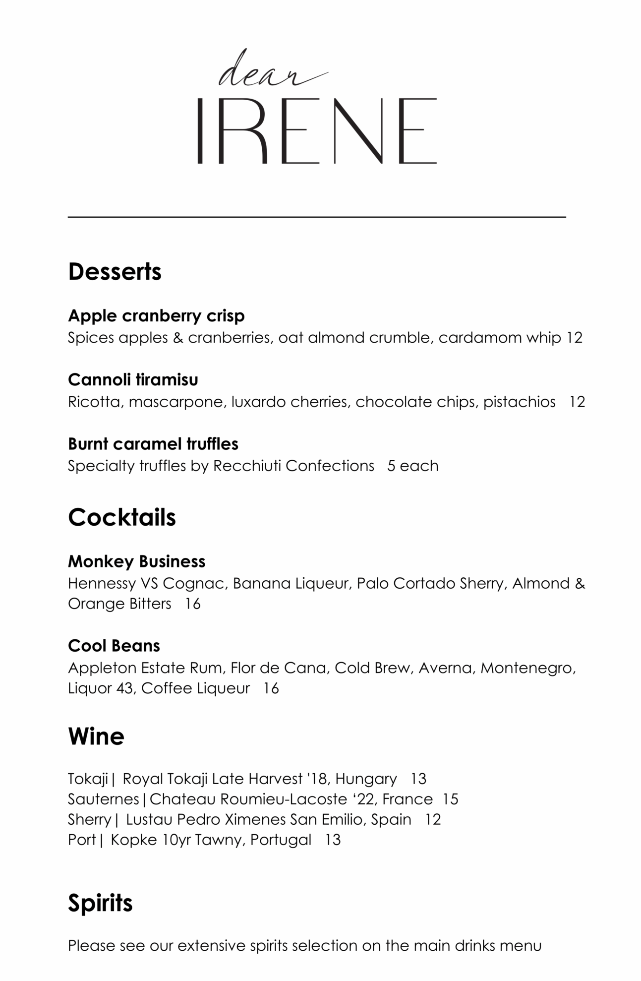Dear Irene encapsulates a progressive restaurant experience in an intimate setting. Our curated cocktails and dishes are meticulously planned, executed, and inspired by the highest quality seasonal Northwest ingredients. We encourage guests to experiment and indulge in new tastes that delight the senses—from tantalizing starters to delectable desserts. We use seasonal and local ingredients and innovate continuously with our menu based on the availability of the best ingredients. As such, our menu continuously changes based on the season and delivery of the freshest produce.
